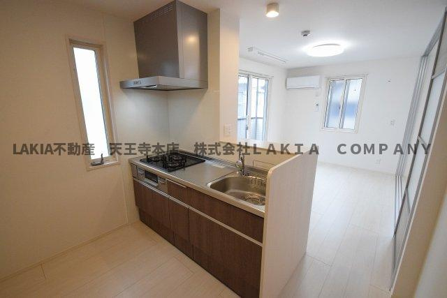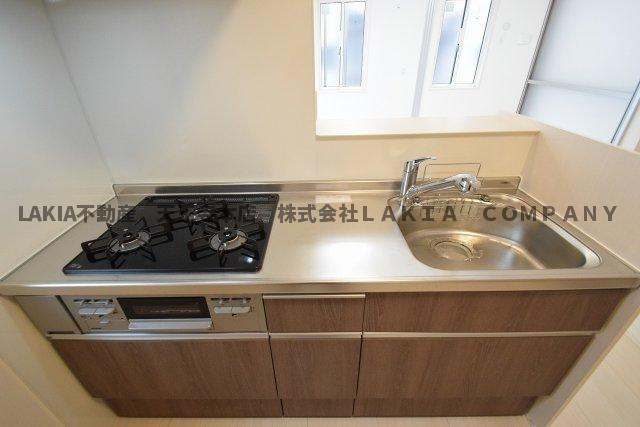 ラムココ真田山のキッチンの良いところは、都市ガス仕様の システムキッチンで三口コンロ搭載で料理の幅が広く、カウンターキッチン形式のためリビングとの一体感があり調理中も会話や見通しがよく、さらに給湯設備や収納も整っていて調理器具や食材を効率よく整理でき、また清掃性の高い素材が使われており汚れが落ちやすく衛生面でも配慮されている点です。