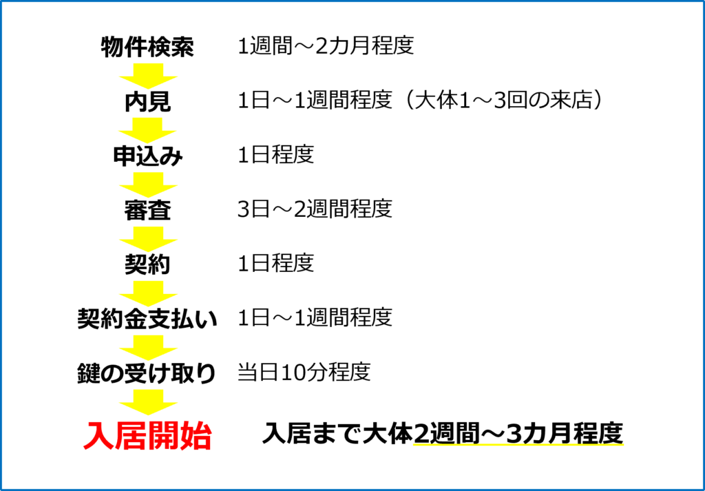 ただし、お部屋探しのほとんどは物件探しにかかる期間で、実際に物件の申込みをしてから入居までは大体2週間~1ヵ月程度です。